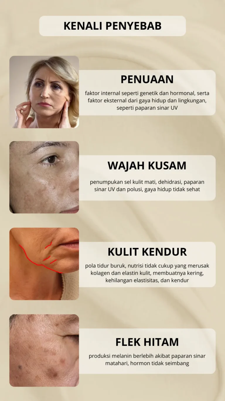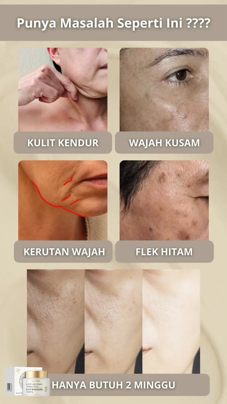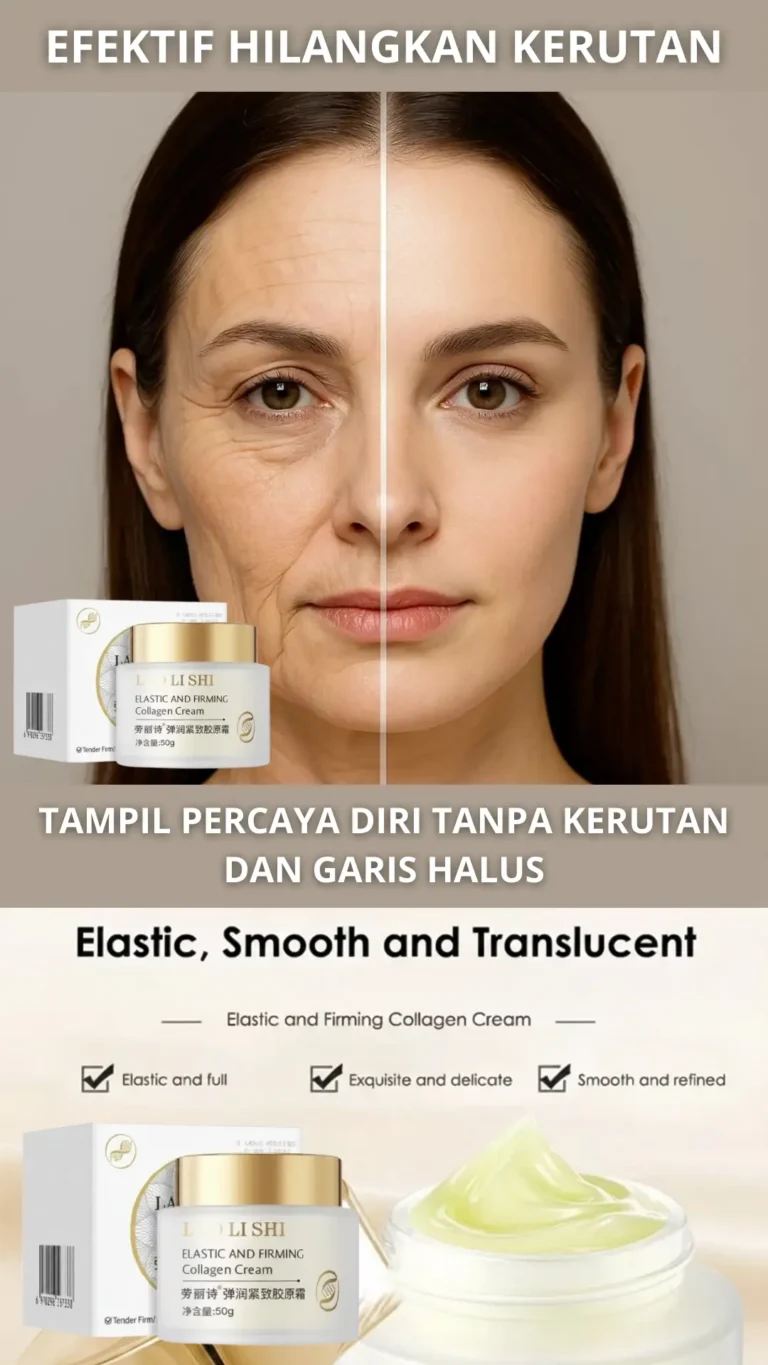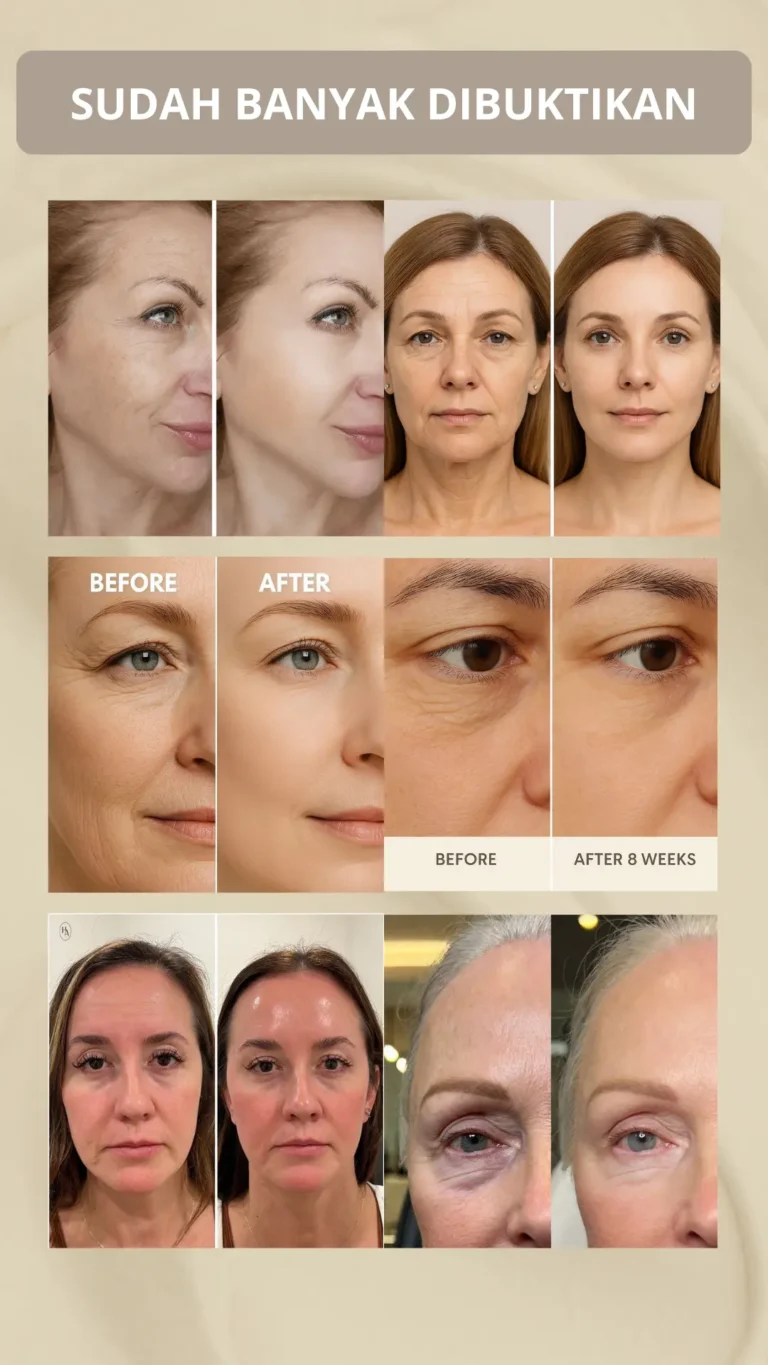 Produk dengan kolagen atau kandungan anti-aging biasanya diklaim mampu membantu tampilan garis halus dan kerutan terlihat lebih halus jika dipakai rutin.